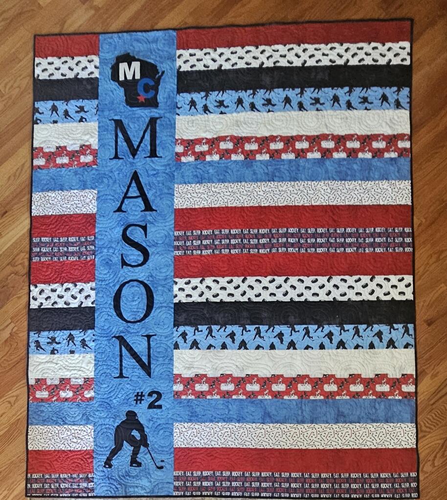 2026 April, Judy made this awesome quilt for her grandson who plays hocked. -